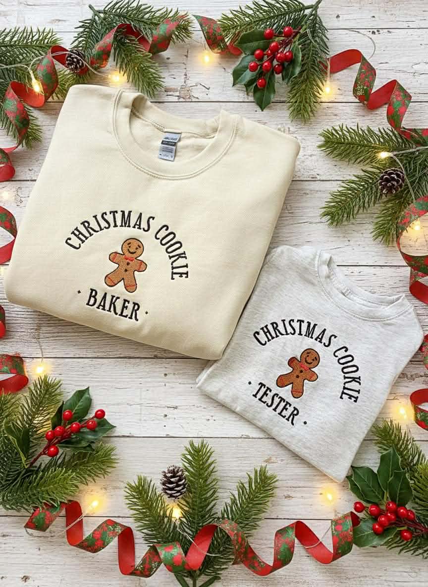Nos chandails brodés Christmas Cookie sont disponibles à l’unité, afin que chaque membre de la famille puisse choisir son rôle : Baker (le chef pâtissier) ou Tester (le goûteur officiel !).
